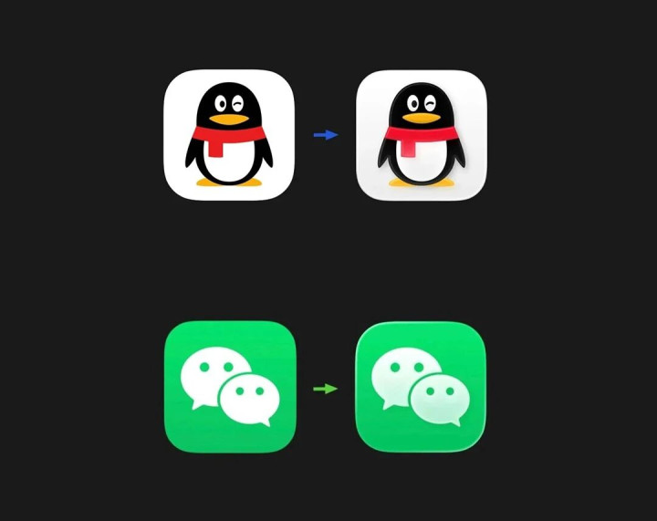 先来对比一下 QQ 图标:现在整只企鹅有轻微的玻璃效果,像极悬浮凸起的感觉,图标背景增加了一点灰色,不像之前企鹅是平面显示无阴影无反光感,有悬浮效果了。