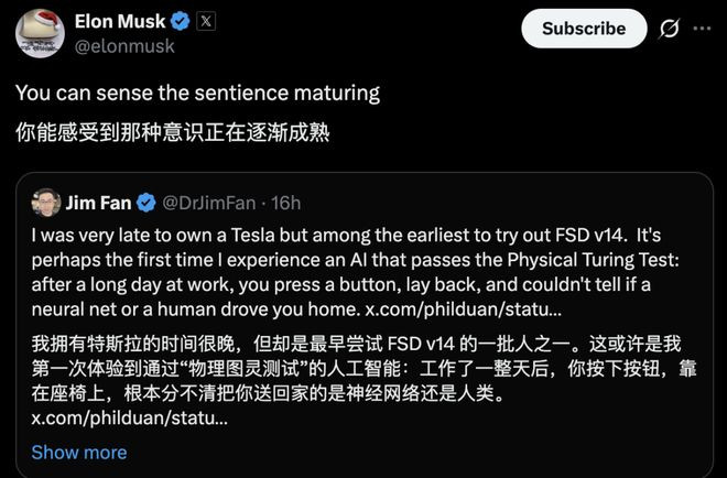 FSDv14赋予了机器「肌肉」与「反应」,Grok赋予了机器「大脑」与「性格」,而Optimus则赋予了智能「行动的躯体」。